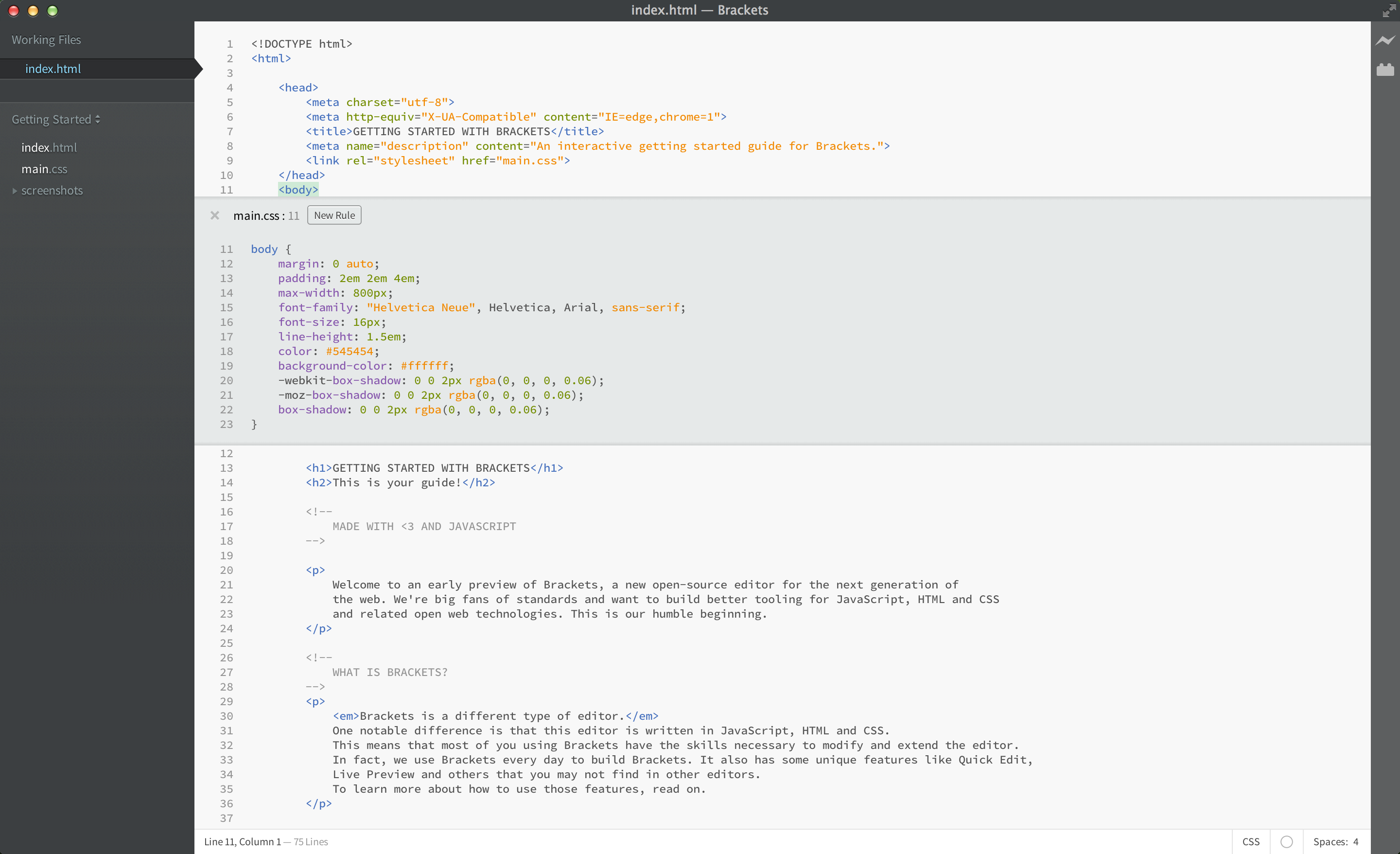 Brackets is a different type of editor. Brackets has some unique features like Quick Edit, Live Preview and others that you may not find in other editors. Brackets is written in JavaScript, HTML and CSS. That means that most of you using Brackets have the skills necessary to modify and extend the editor. In fact, we use Brackets every day to build Brackets. To learn more about how to use the key features, read on.